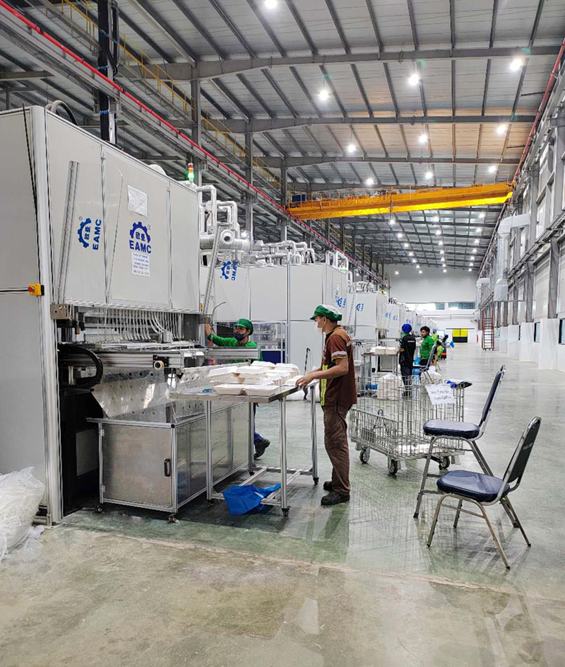 在国际禁塑的大环境下,在KTIS集团下属的著名蔗渣浆厂EPPCO第一期购买了欧亚轻工EAMC的4条生产线并投入了使用的基础上,泰国KTIS集团决定投资成立新的(第二期)全自动纸浆模塑工厂EPAC,生产各种纸浆模塑产品。经过对全世界各种纸浆模塑设备的考察筛选,泰国KTIS集团一次性购买了50台EAMC全自动纸浆模塑成型定型切边一体机生产线。这是欧亚轻工的又一个大型回头客。